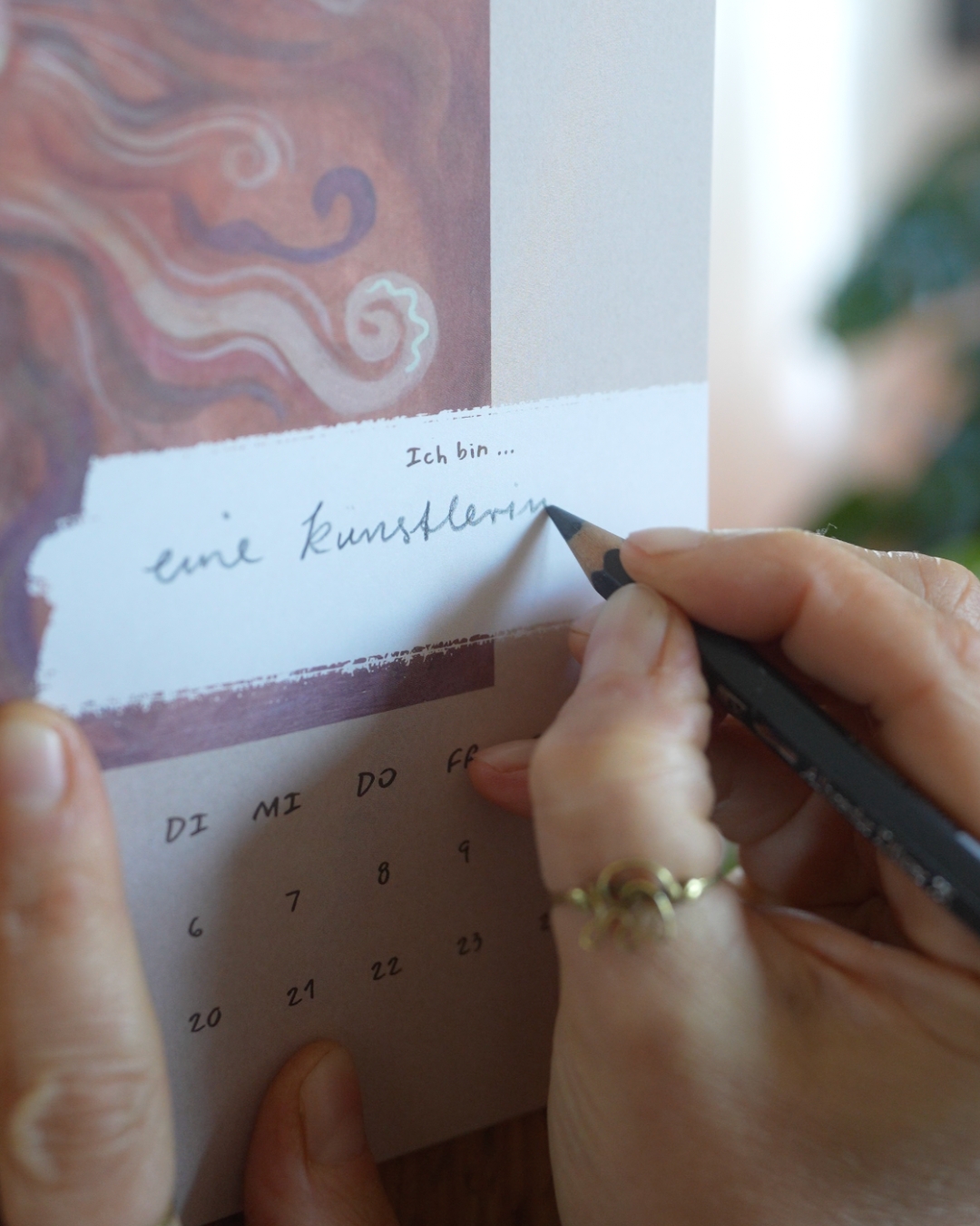 Diesmal neu: kurze Impulse, Fragen und Satzanfänge. Sie laden dich ein, einen Moment innezuhalten und deine eigenen Antworten zu entdecken – ein oder wenige Worte können schon viel bewegen. Und so wird jeder Monat nicht nur von Kunst, sondern auch von deinem ganz persönlichen Ausdruck getragen.